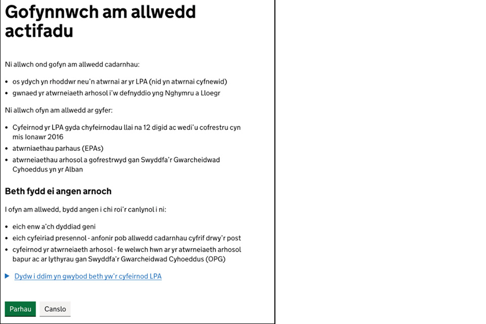 Gallwch ddilyn y cyfarwyddiadau hyn i ofyn am allwedd actifadu ar gyfer atwrneiaeth arhosol (LPA).
