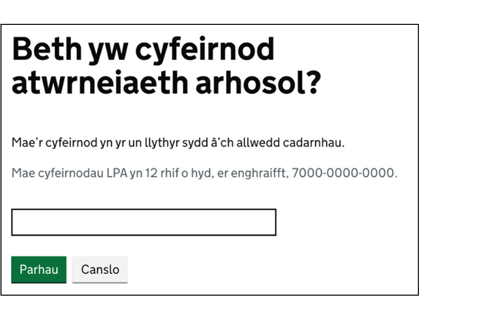 I wneud hyn, mae angen cyfeirnod LPA arnoch, a’r allwedd actifadu sy’n cyfateb i’r LPA hwnnw. Mae’r rhain i’w gweld yn y llythyr a anfonwyd atoch pan gafodd yr LPA ei gofrestru.