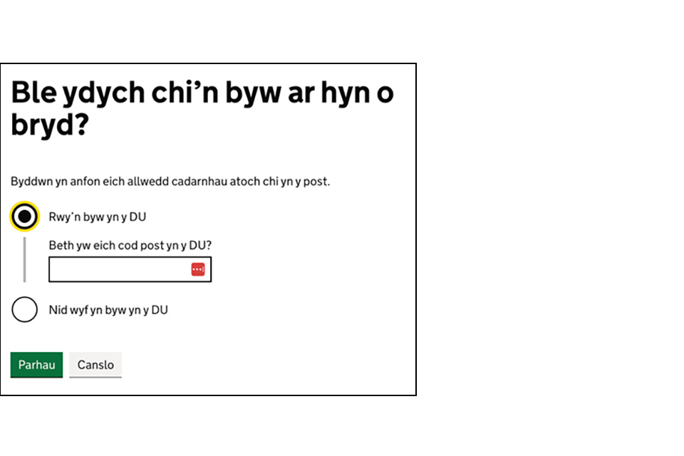 Os ydych yn byw yn y DU, gellir dod o hyd i’ch cyfeiriad yn awtomatig gyda’r cod post. Os nad ydych yn byw yn y DU, gofynnir i chi roi eich cyfeiriad llawn.