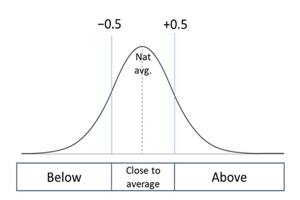 National distribution banding shows how the school or local average figure compares with the national figure. If the value is more than 0.5 standard deviations (SDs) above the national rate, it is classed as ‘Above average’. If it is less than 0.5 SDs below the national rate, it is classed as ‘Below average’. If it is more than one SD above the national rate, it is classed as ‘Well above average’ and highlighted in blue. If it is at less than one SDs below the national rate, it is classed as ‘Well below average’ and highlighted in orange. Otherwise, it is ‘Close to average’ and shown in grey.