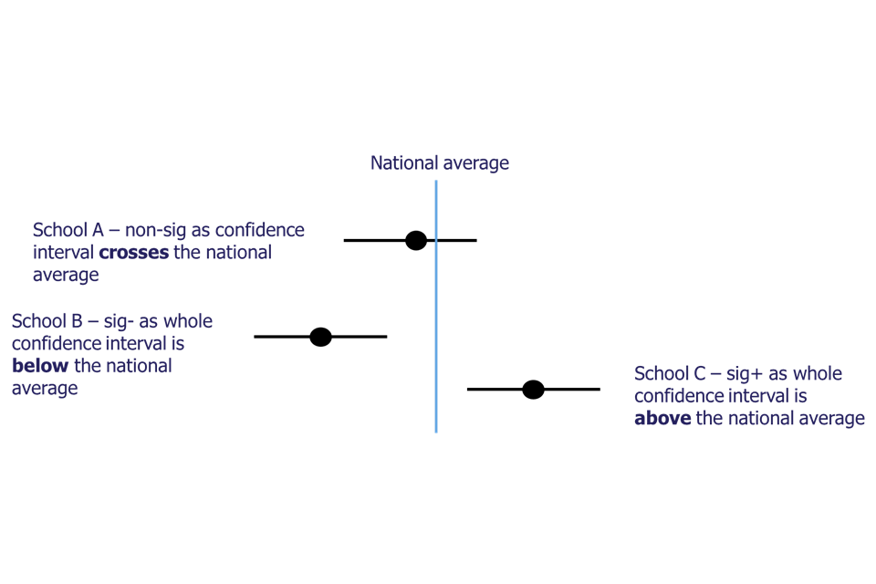 The figure above is an example of how the CI is used to decide statistical significance. It helps us quickly assess whether a school’s outcomes stand out in a statistically reliable way, or whether they fall within the expected range of variation. If the CI does not cross the national average line, we can say that the school’s performance is statistically significant – either significantly above (sig+) or significantly below (sig−) the national average. If the CI does cross the national average line, then the school’s performance is not statistically different from the national average – this is labelled as non-significant (non-sig).