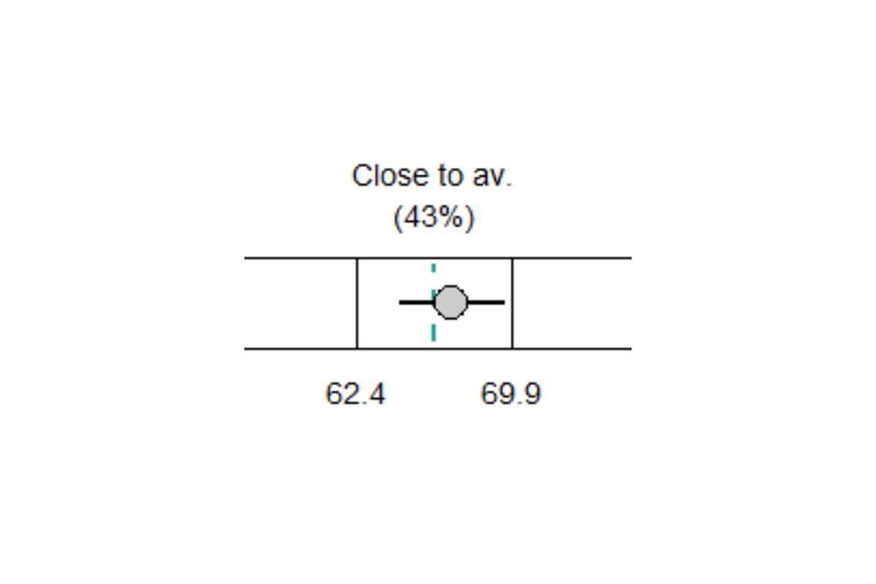 This is a section of a distributional analysis showing the ‘Close to average’ range. Close to average is represented by a rectangular box and ranges from 62.4 to 69.9 along the horizontal axis. Inside the box, there is a grey dot (indicating a school’s observed performance) and a horizontal line through the grey dot (indicating the confidence interval of their performance). There is also a vertical turquoise dashed line indicating the national average.