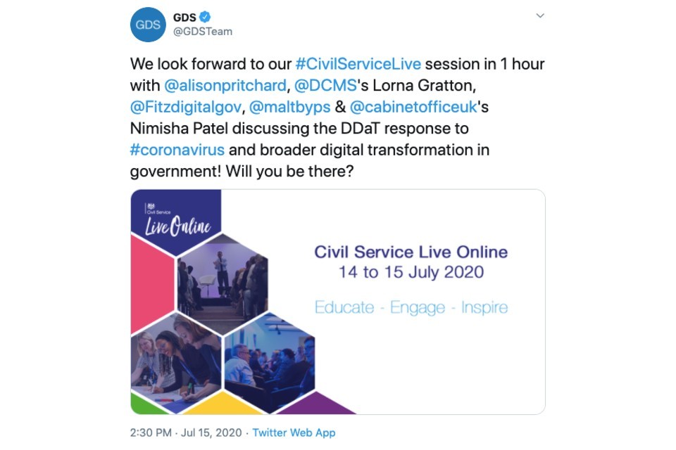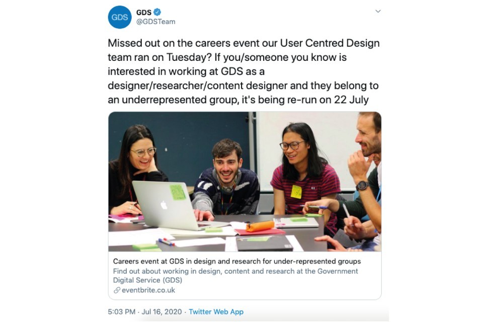 GDS team tweeted: Missed out on the careers event our User Centred Design team ran on Tuesday? If you/someone you know is interested in working at GDS as a designer/researcher/content designer and they belong to an underrepresented group, it’s being re-run on 22 July.