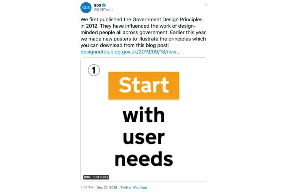 GDS team tweeted: We first published the Government Design Principles in 2012. They have influenced the work of design-minded people all across government. Earlier this year we made new posters to illustrate the principles which you can download from this blog post.