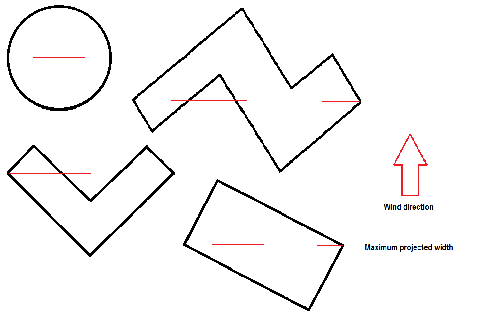 Figure showing how to measure maximum projected width of a building to work out the effects of building downwash.