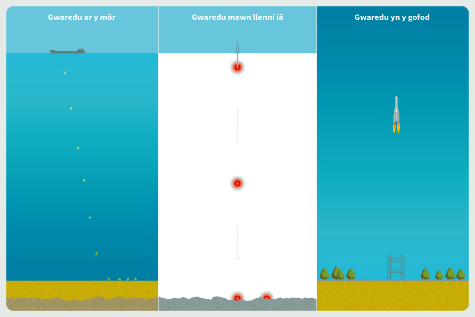 Mae dewisiadau amgen wedi cael eu hystyried yn ofalus ac rydym yn parhau i adolygu opsiynau. Ar hyn o bryd, mae pob un naill ai ddim yn dechnolegol bosibl (er enghraifft: troi’r gwastraff yn ddeunydd anymbelydrol), ddim yn amgylcheddol ddiogel (er enghraifft; gwaredu yn y môr neu mewn llenni ia), neu’n rhy beryglus i’w gweithredu (er enghraifft: tanio’r gwastraff i’r gofod mewn rocedi).