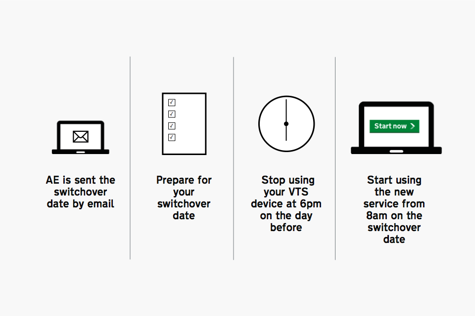 Your actual switchover will take place at 8am on your switchover date. Your VTS device and smart card reader will be turned off.